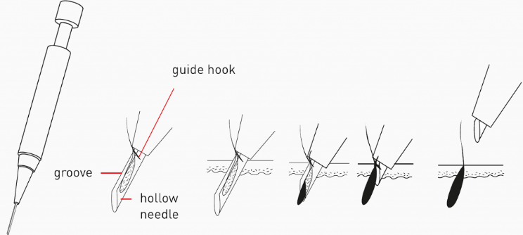 1. เข็มเจาะ (Needle) มีลักษณะเป็นรูกลวงไม่ได้เชื่อมติดกันทั้งหมดแต่จะมีช่องเว้นไว้เพื่อให้ใส่กราฟท์ผมและใช้เจาะเข้าไปบนหนังศีรษะ เพื่อสร้างรูปลูกผม