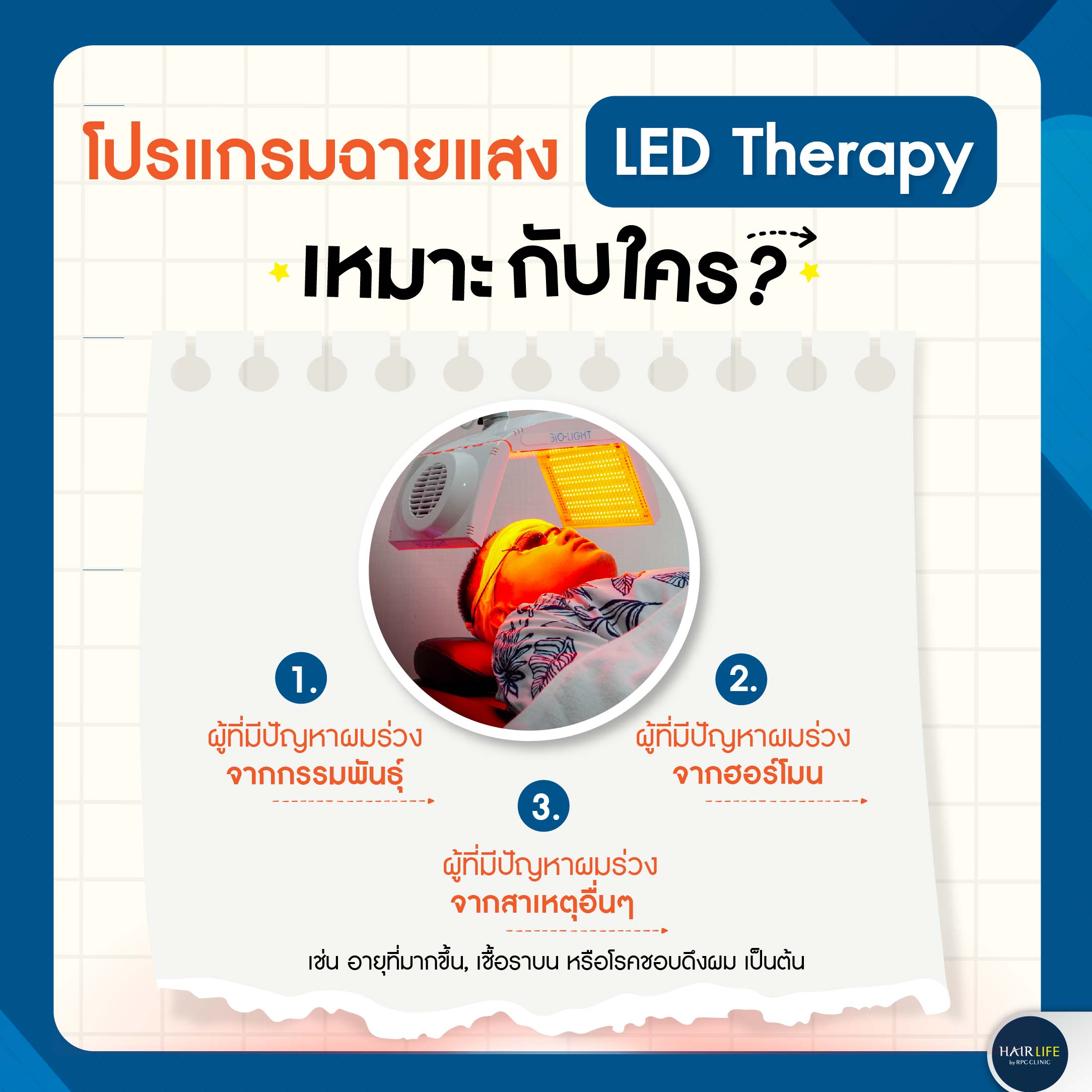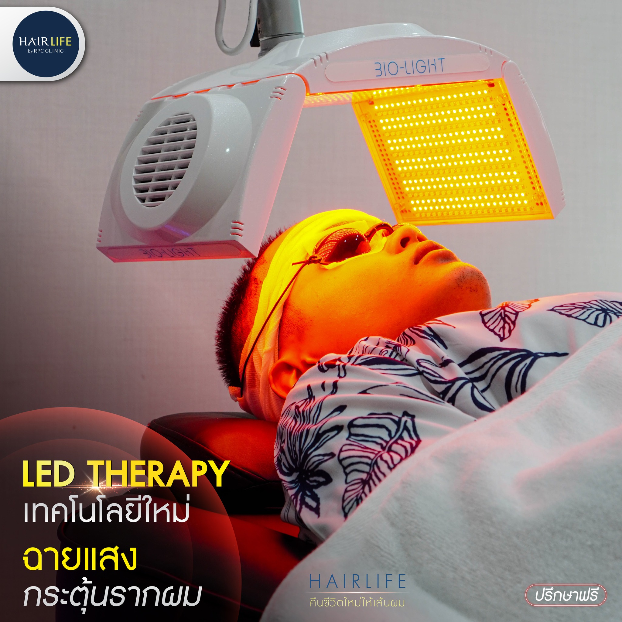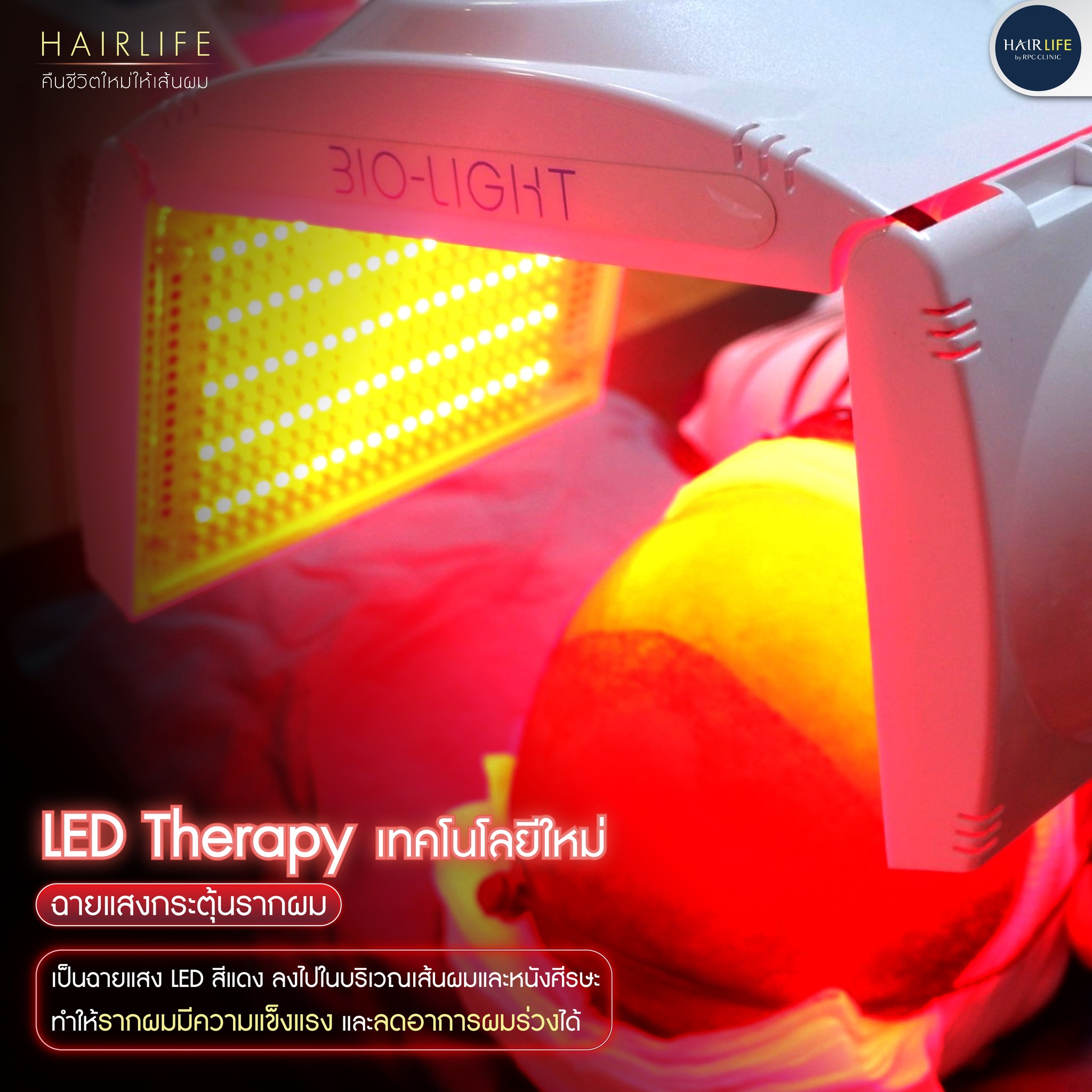LED หรือ Light-Emitting Diode เป็นฉายแสงสีแดงที่มีความยาวคลื่นนาโนด้วยความเข้มข้นต่ำ ลงไปในบริเวณเส้นผมและหนังศีรษะ โดยแสงนี้จะทำหน้าที่เข้าไปกระตุ้นการไหลเวียนของเลือดบริเวณหนังศีรษะ ช่วยเพิ่มออกซิเจน และสารอาหารบริเวณเซลล์รากผม ทำให้รากผมมีความแข็งแรง และลดอาการผมร่วง